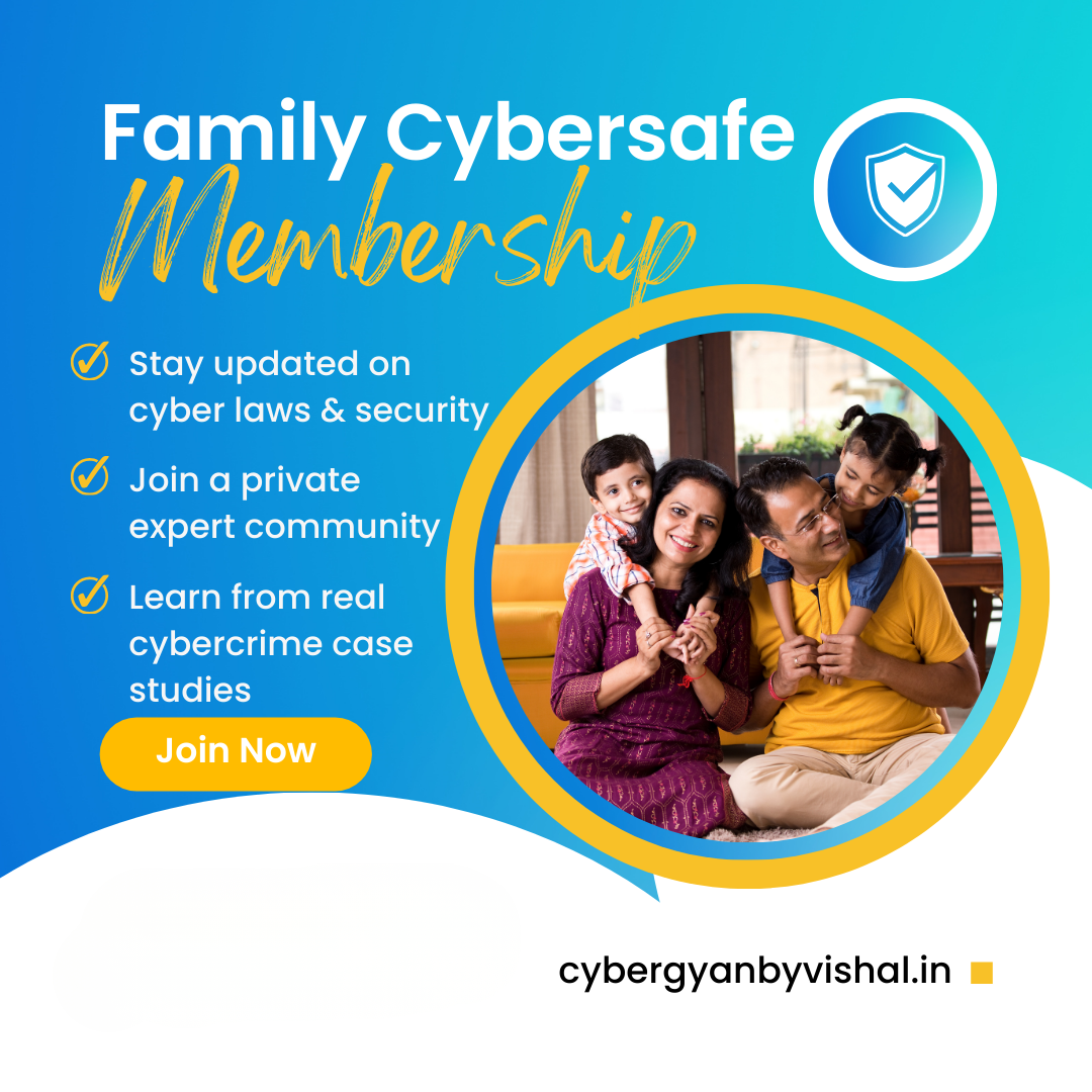 CyberGyan by Vishal’s Family Cybersafe Membership offers exclusive access to cybersecurity insights, legal updates, and expert guidance to keep your family safe online. Join our private Telegram/WhatsApp group and attend monthly live webinars with real-world cybercrime case studies handled by top cyber crime lawyers in India.